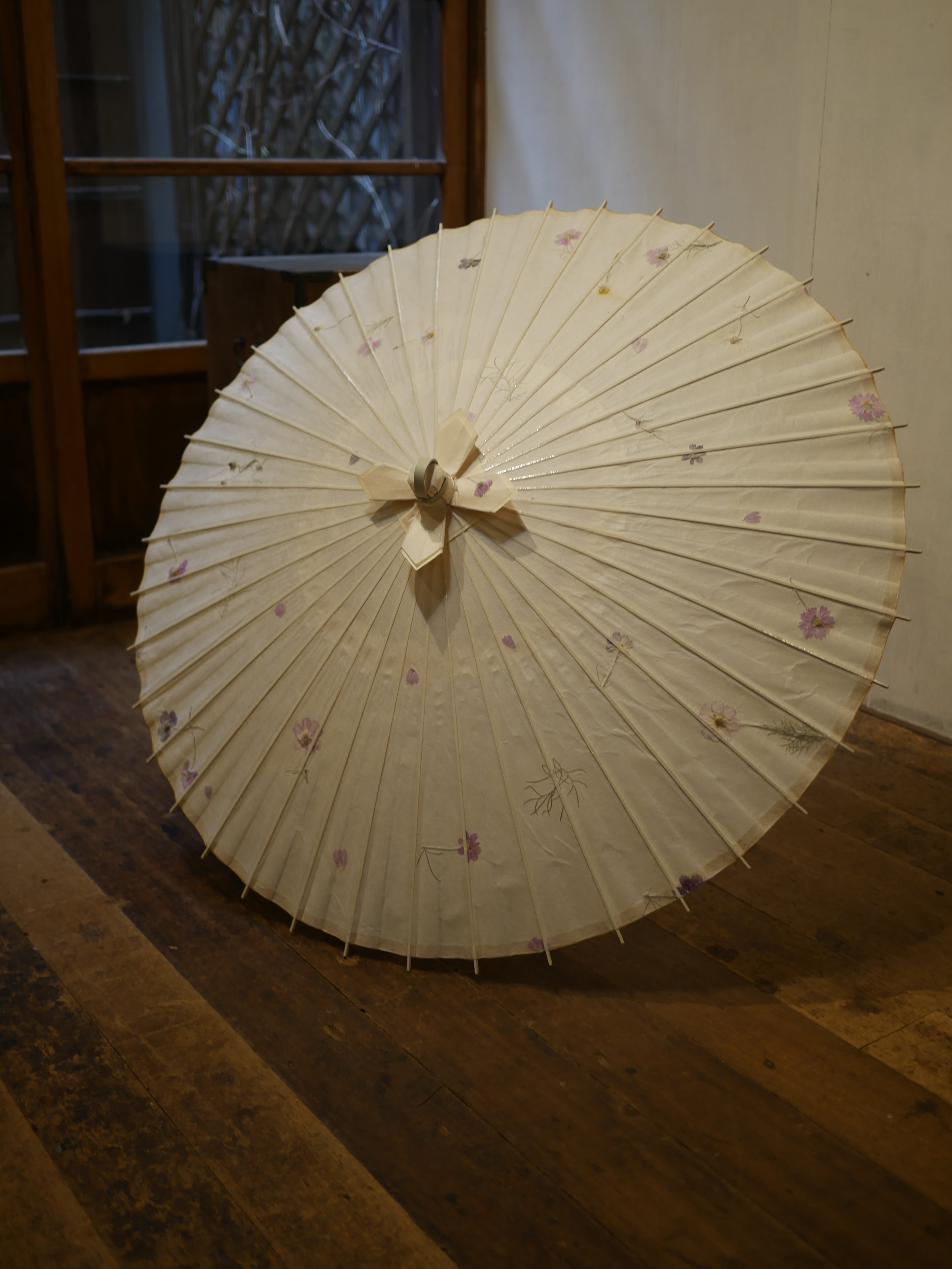 本物のコスモスの花が和紙に漉き込まれた特注の紙とは日傘となります。