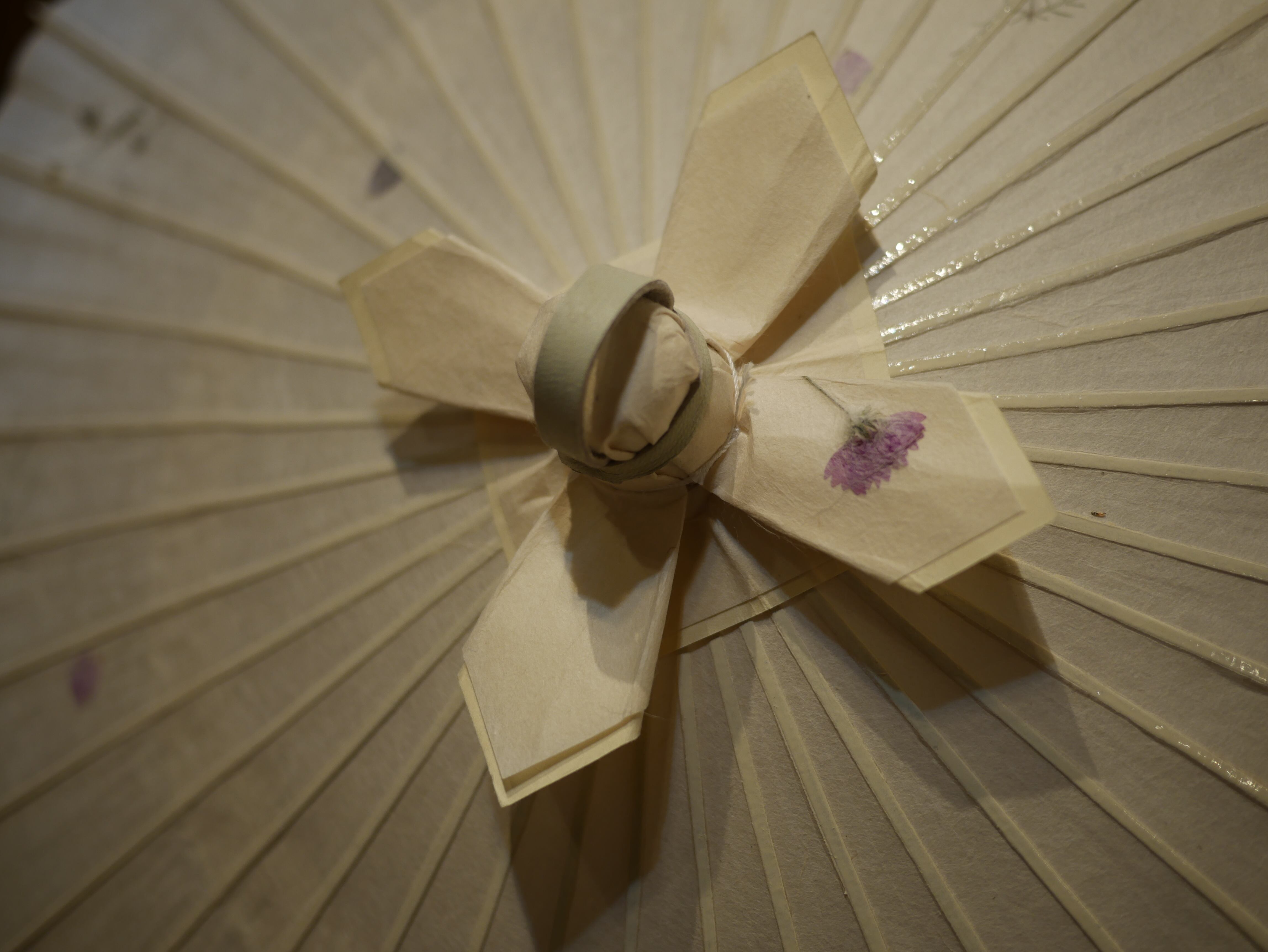 This parasol features custom paper made by incorporating real cosmos flowers into Japanese paper.