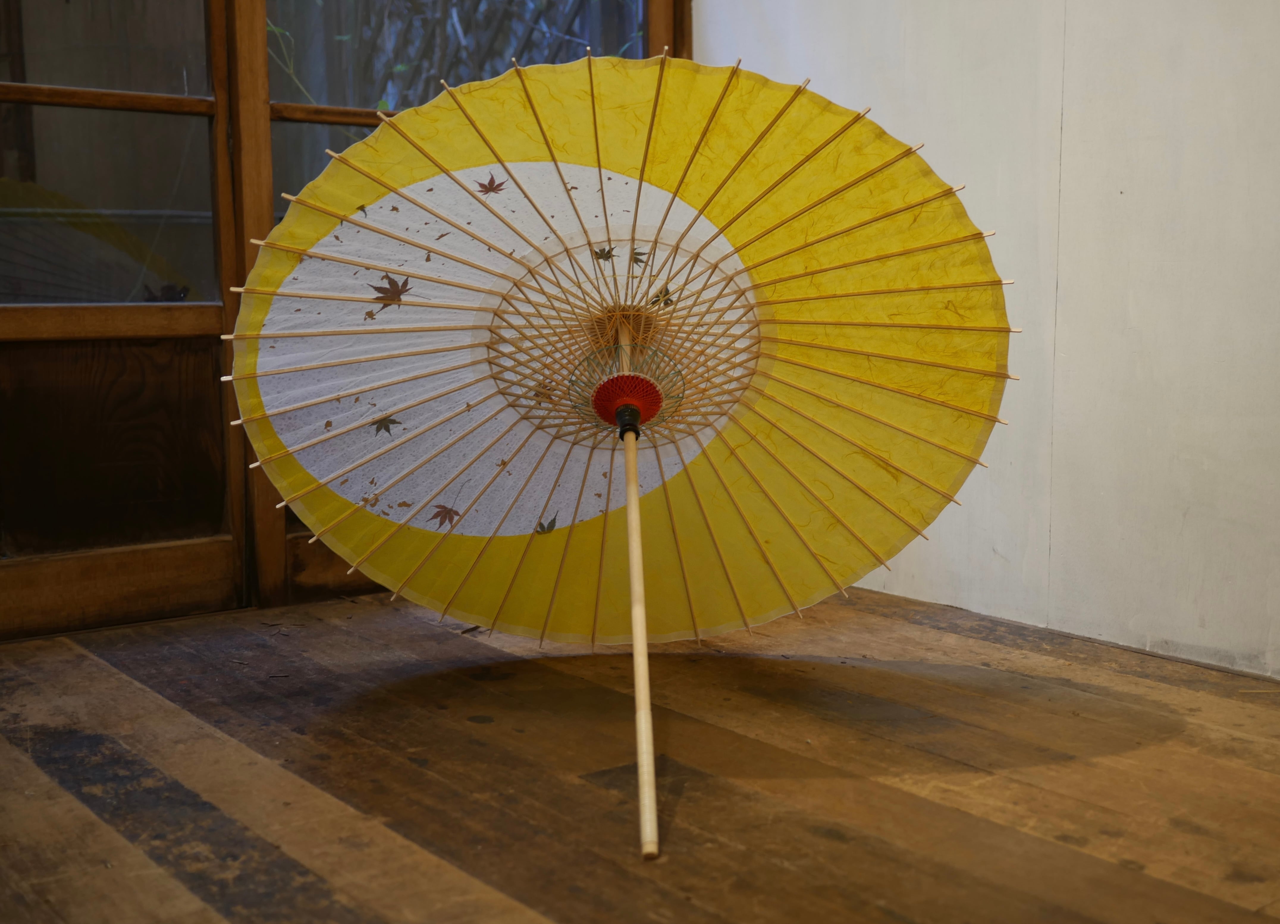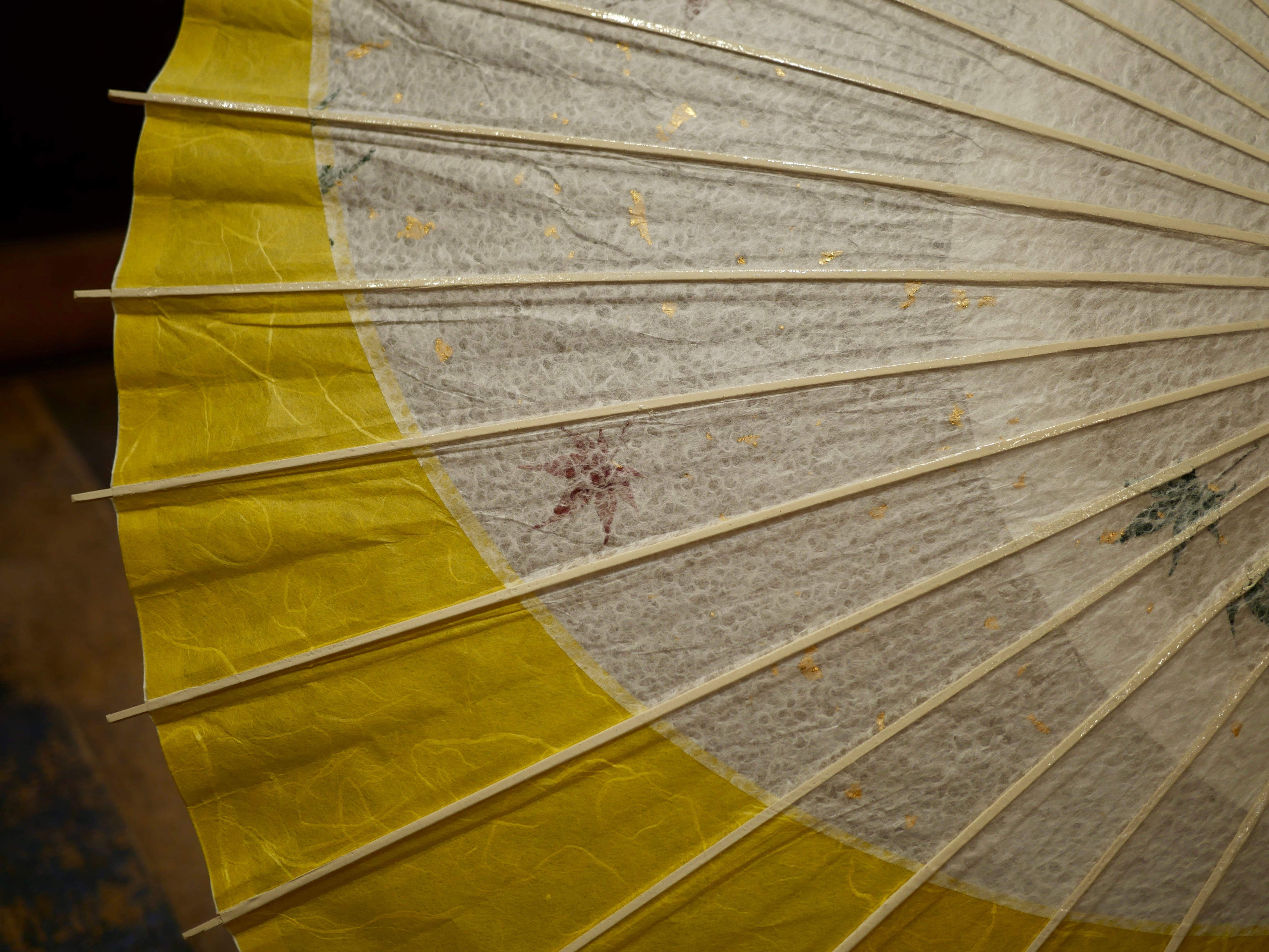 A parasol made with handmade Japanese paper that contains real maple grass leaves.