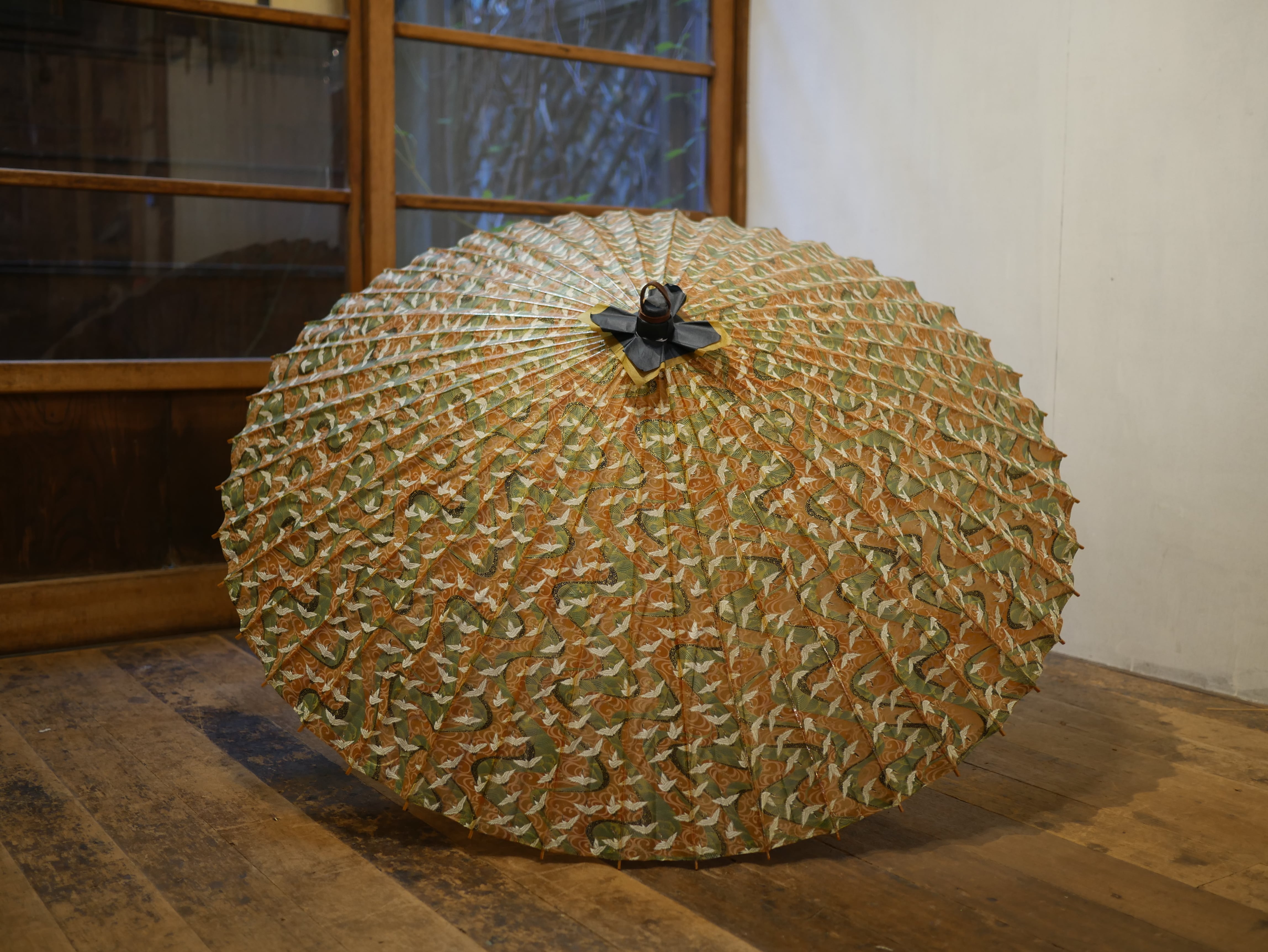 This umbrella features a design adorned with cranes, a traditional motif symbolizing longevity.