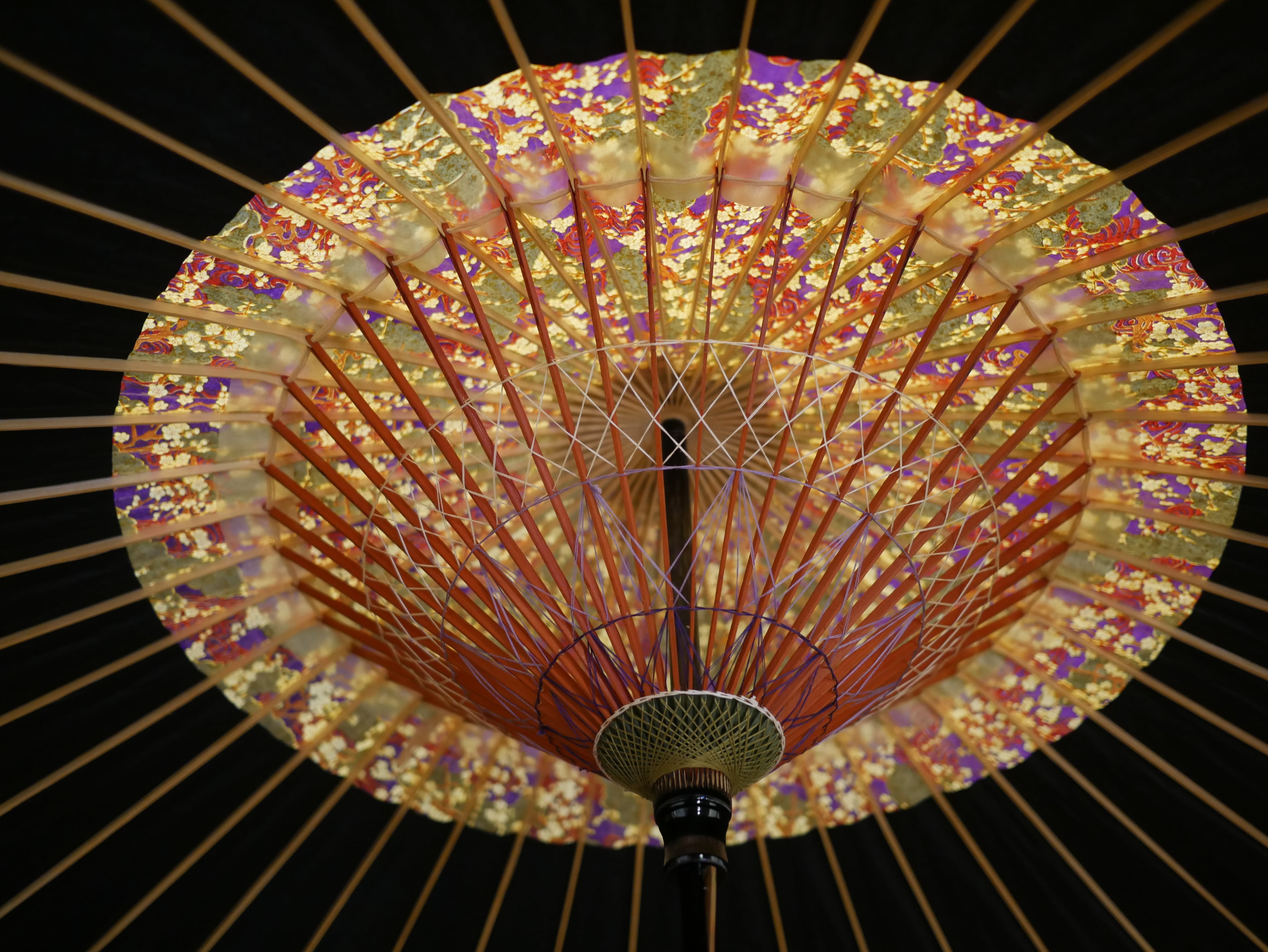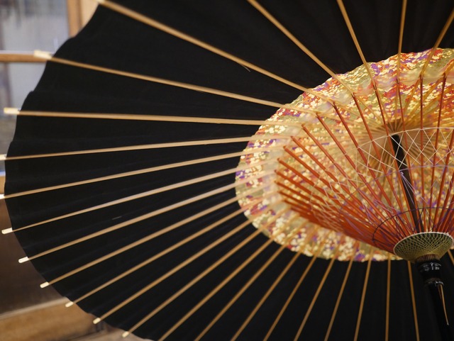 This umbrella is made with Japanese paper adorned with a plum blossom pattern.